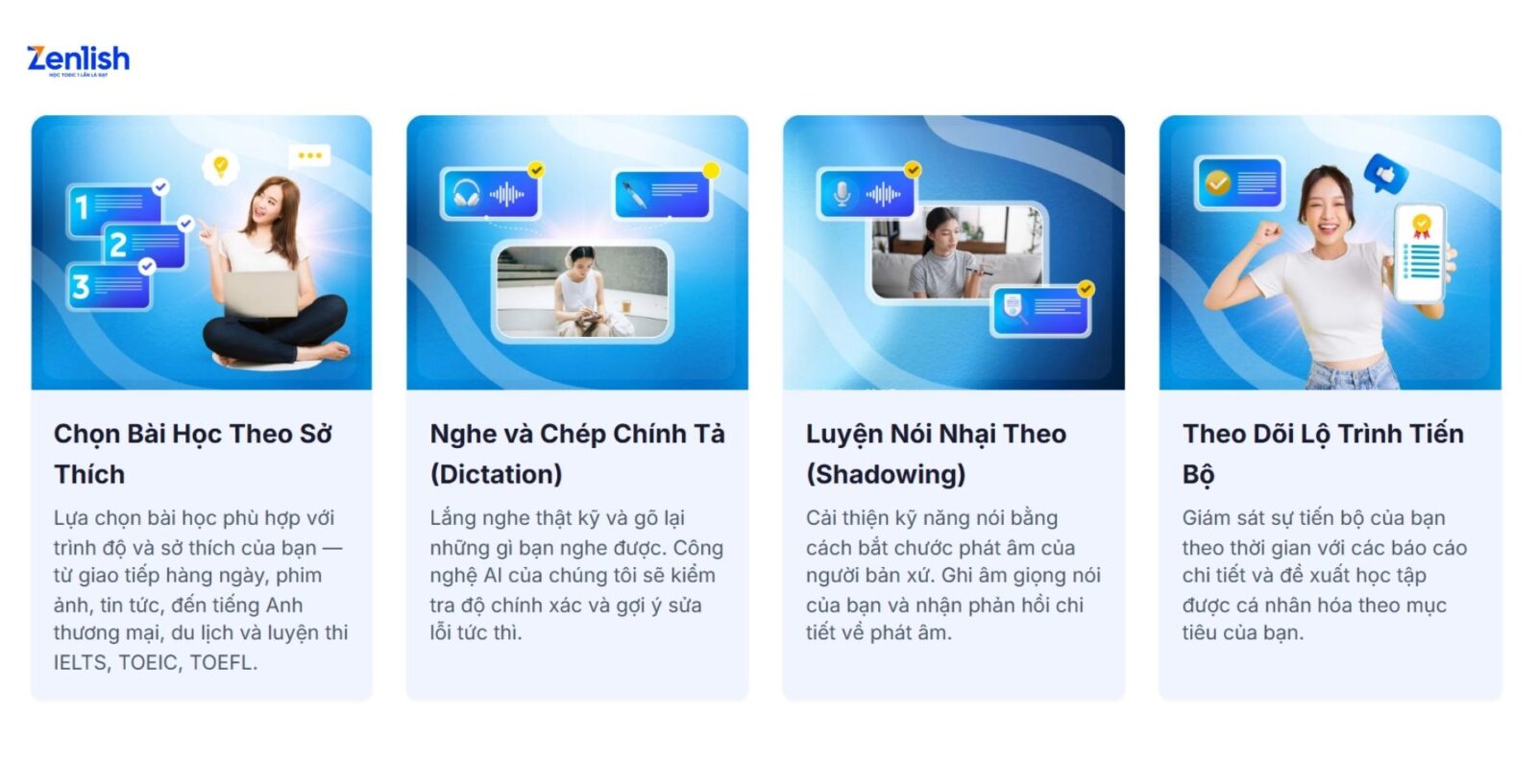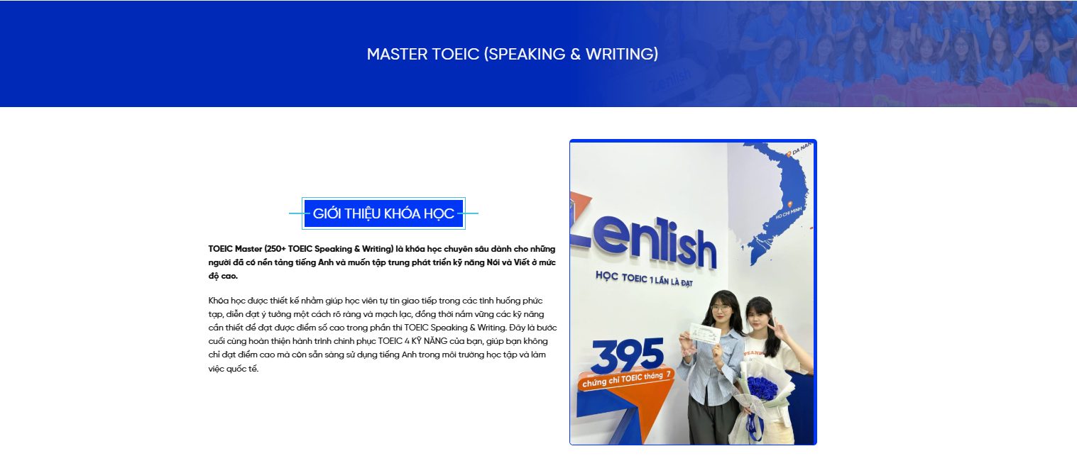 Nếu bạn đã có nền tảng tiếng Anh và mong muốn nâng cao kỹ năng Nói và Viết một cách chuyên sâu, khóa học TOEIC Master (250+ TOEIC Speaking & Writing) tại Zenlish là lựa chọn phù hợp để hoàn thiện hành trình chinh phục TOEIC 4 kỹ năng.