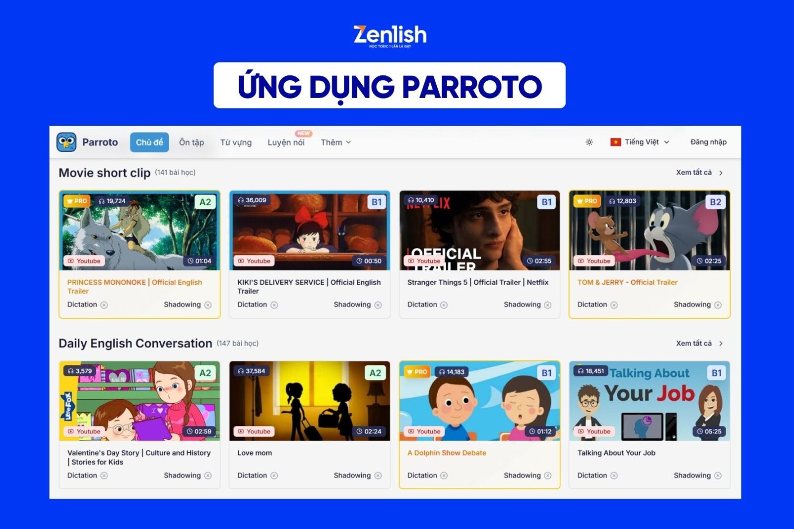 Parroto là ứng dụng luyện nghe – nói tập trung vào thực hành chủ động thông qua Dictation và Shadowing.