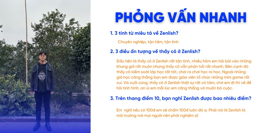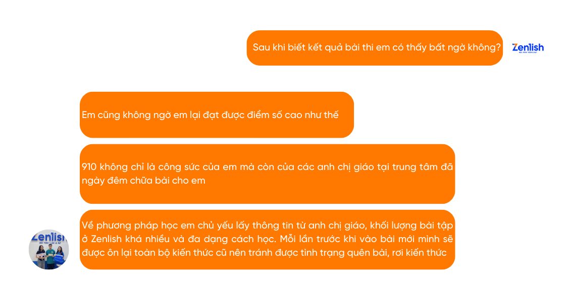 Sau khi lấy chứng chỉ về Dũng không quên gửi lời cảm ơn của mình tới thầy cô giáo tại Zenlish: “Em muốn gửi lời cảm ơn tới thầy cô vì đã đồng hành cùng em suốt khoá học vừa qua, nhờ kiến thức mà thầy cô trang bị cho em thì em mới có được kết quả tốt như vậy ạ.”