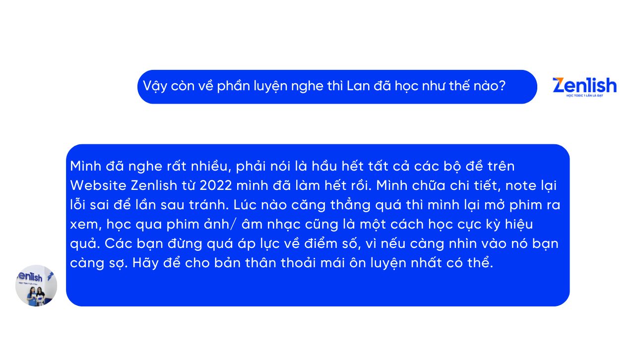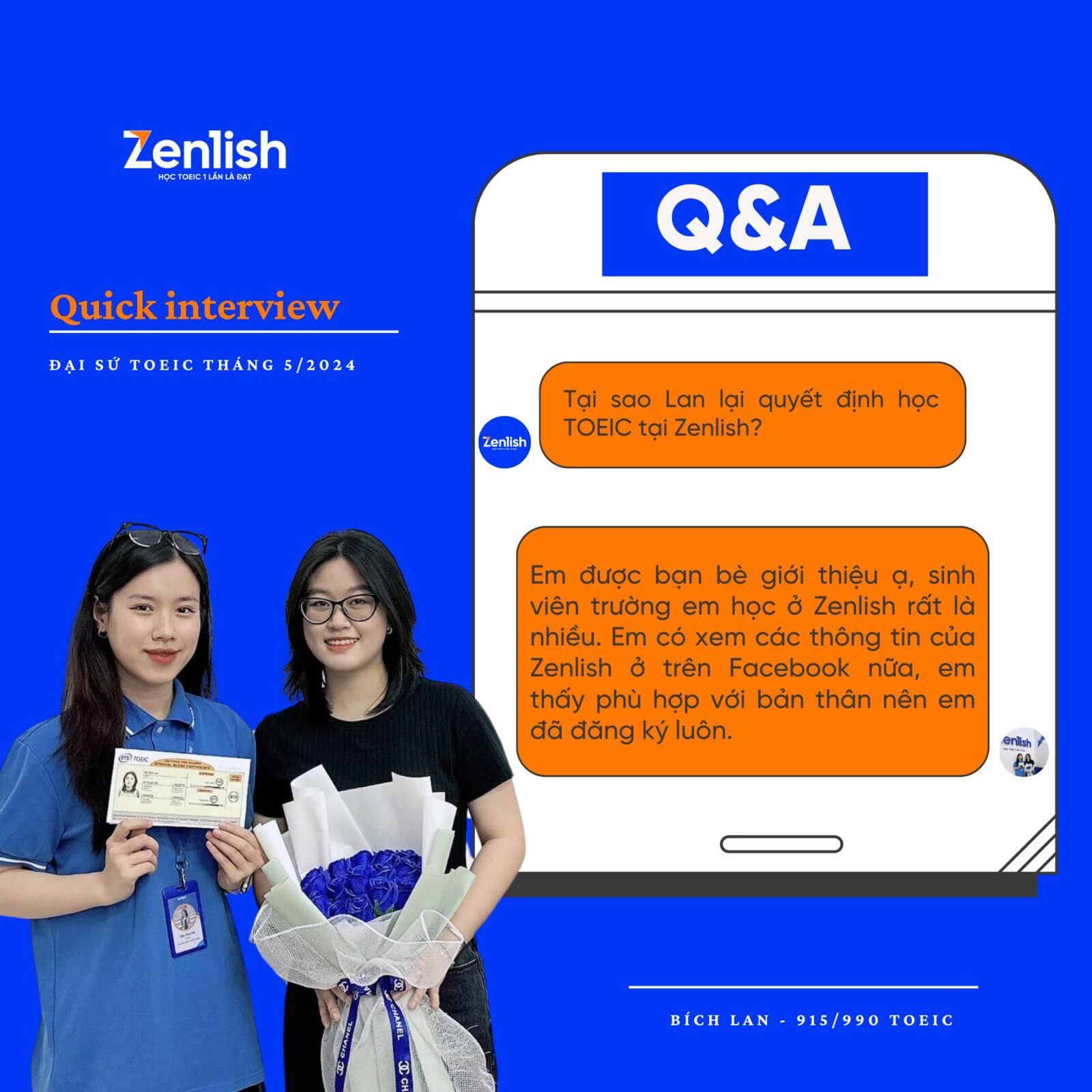Sau nhiều lần đắn đo và tham khảo nhiều chỗ học TOEIC, Lan đã chọn Zenlish là nơi để bắt đầu hành trình chinh phục TOEIC của mình, và quyết định này đã mang lại kết quả đáng kinh ngạc. Với một môi trường học tập chuyên nghiệp và sự hỗ trợ tận tình từ đội ngũ giáo viên, Lan đã có được nền tảng kiến thức vững chắc và được trang bị những kỹ năng cần thiết để đối mặt với kỳ thi quan trọng.