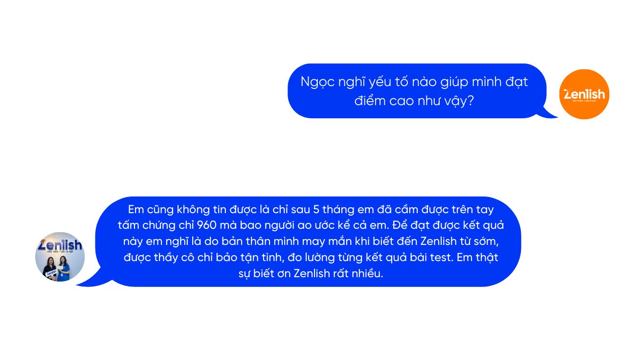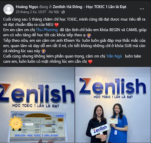 Thành công của Thanh Ngọc không chỉ là niềm tự hào cá nhân mà còn là niềm vinh dự cho Zenlish, là minh chứng rõ ràng cho lời cam kết của trung tâm với học viên. Chứng chỉ 960 TOEIC hứa hẹn sẽ mở ra cánh cửa nghề nghiệp rộng lớn cho cô trong tương lai. Chúc mừng Thanh Ngọc và mong rằng sự nỗ lực của cô sẽ là nguồn động viên cho những học viên khác tại Zenlish.