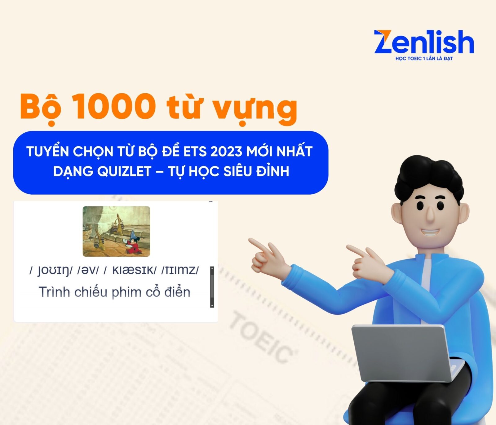 Nhằm giúp các bạn học TOEIC có được 1 hệ thống từ vựng chọn lọc, dễ học, dễ nhớ. Zenlish đã tổng hợp và biên soạn bộ “DANH MỤC 1000 TỪ VỰNG TOEIC TUYỂN CHỌN TỪ BỘ ĐỀ ETS 2023 MỚI NHẤT DẠNG QUIZLET – TỰ HỌC SIÊU ĐỈNH”