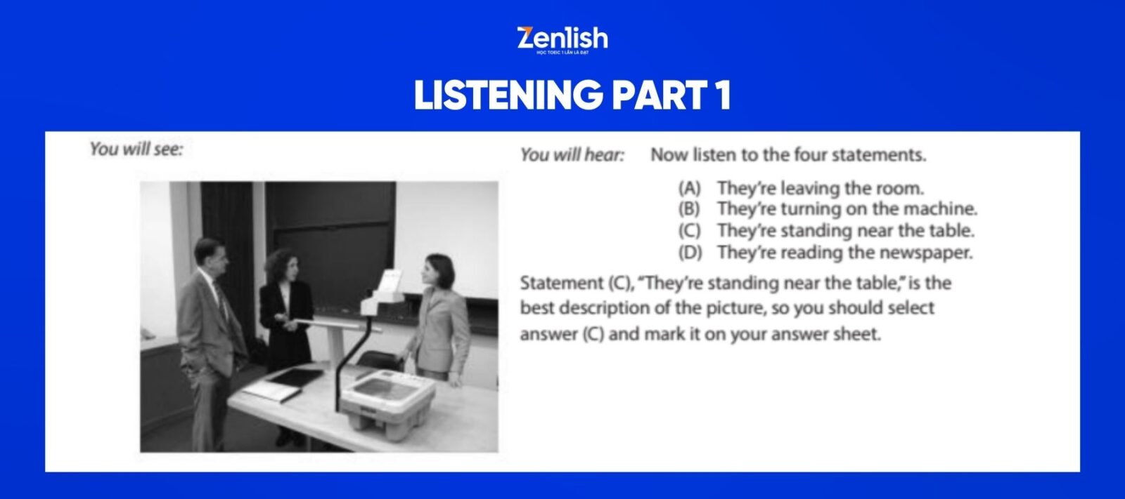 Ở Part 1, thí sinh sẽ nghe 6 câu mô tả cho mỗi bức hình và chọn câu mô tả phù hợp nhất với hình ảnh được cung cấp. Các câu hỏi không in trong đề, vì vậy người thi cần tập trung cao độ ngay từ đầu.