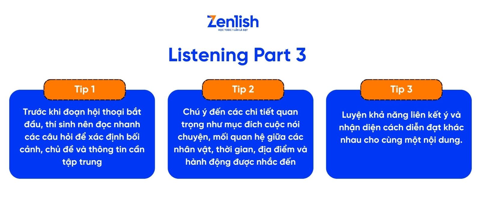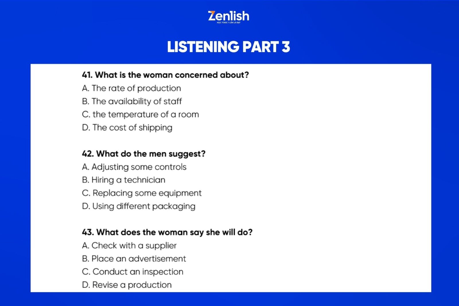 Part 3 nâng độ khó khi thí sinh phải nghe các cuộc hội thoại dài hơn và trả lời nhiều câu hỏi cho mỗi đoạn. Điểm thuận lợi là câu hỏi và đáp án đã được in sẵn trên đề, cho phép người học đọc trước và định hướng nội dung cần nghe.