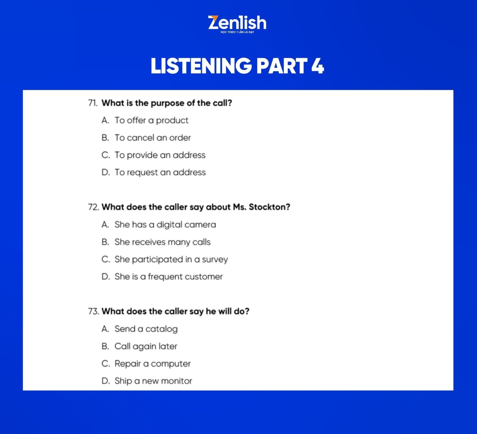 Part 4 là phần thử thách khả năng nghe hiểu ở mức cao hơn, khi thí sinh phải xử lý các bài nói mang tính thông báo, quảng cáo, báo cáo hoặc tin nhắn ghi âm. Mỗi đoạn nghe thường đi kèm nhiều câu hỏi, đòi hỏi người nghe phải nắm được mạch nội dung ngay từ đầu.