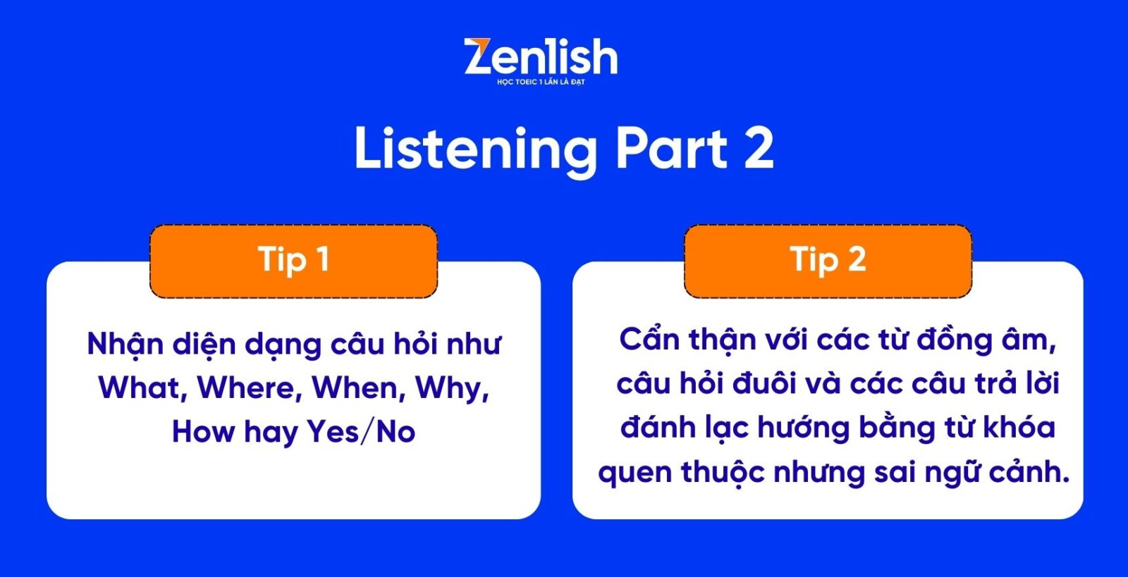 Part 2 là phần khiến nhiều thí sinh mất điểm vì tốc độ nhanh và không có văn bản in sẵn. Mỗi câu hỏi chỉ được nghe một lần, yêu cầu người nghe phải xác định nhanh loại câu hỏi và chọn phản hồi phù hợp nhất.