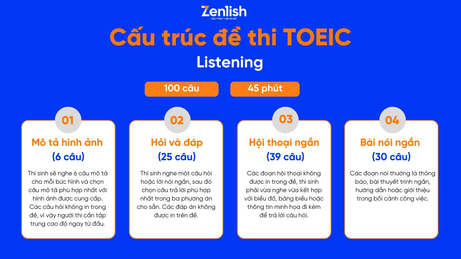 Phần Listening trong đề thi TOEIC kéo dài 45 phút, bao gồm 100 câu hỏi, được chia thành 4 Part. Cụ thể, cấu trúc phần Listening như sau: