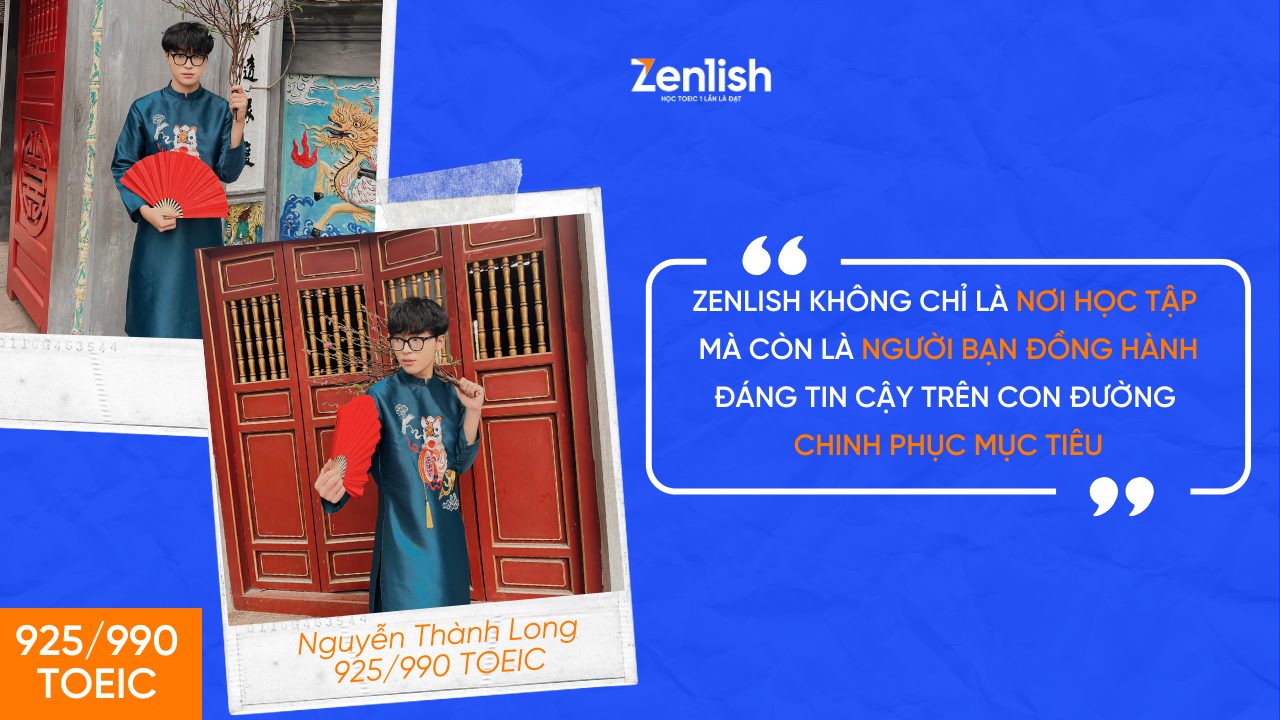 Với xuất phát điểm 800 TOEIC, Nguyễn Thành Long, sinh viên Đại học Kinh tế Quốc dân (NEU), đã quyết tâm bứt phá để đạt 925 điểm chỉ trong một thời gian ngắn. Cùng Zenlish, Long không chỉ hoàn thiện kỹ năng của mình mà còn khám phá ra nhiều phương pháp và chiến thuật học hiệu quả để chinh phục kỳ thi TOEIC.