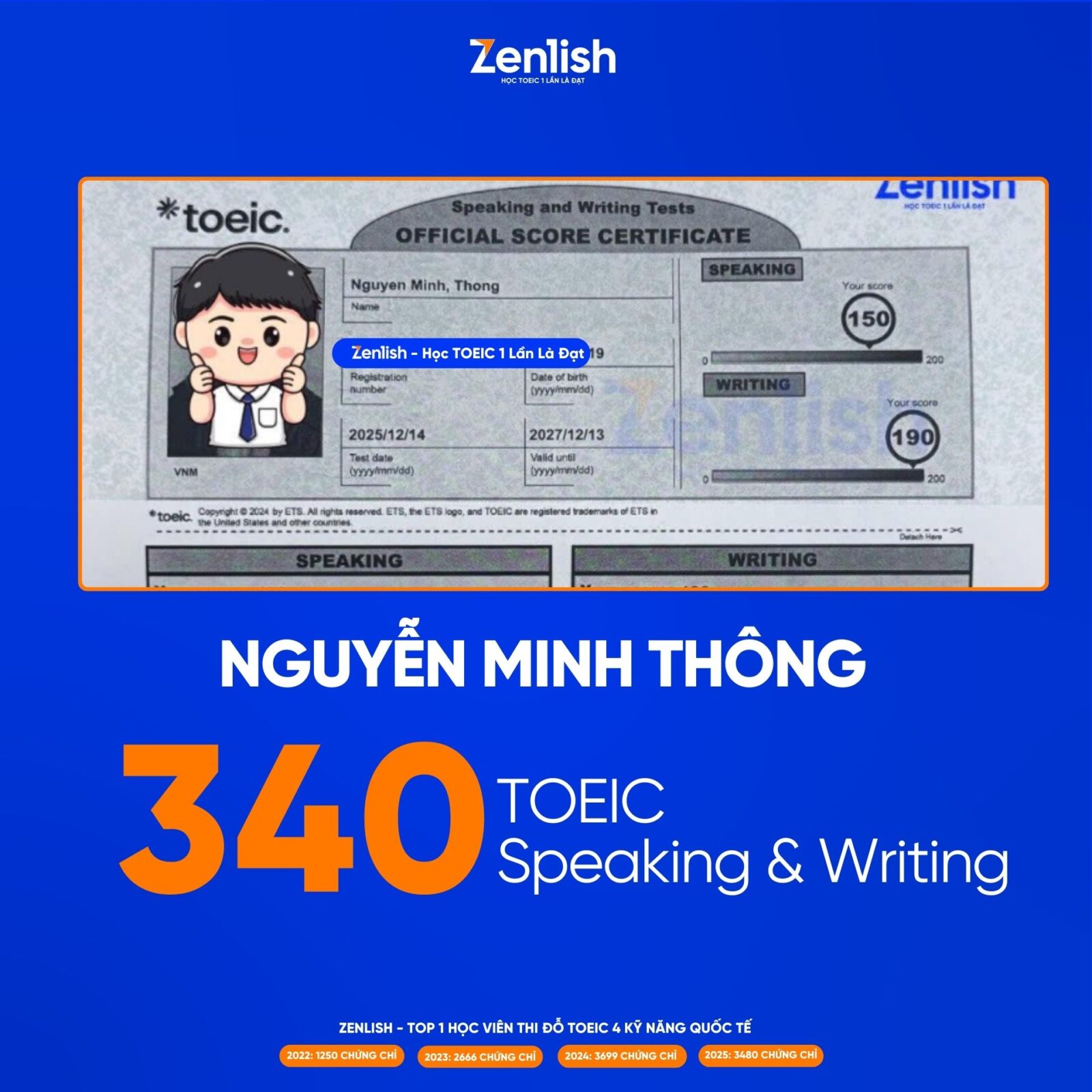 Nguyễn Minh Thông (NEU) đã xuất sắc cán mốc 340/400 TOEIC Speaking & Writing ngay lần thi đầu tiên. Đây không chỉ là một tấm bằng, mà là chiến lược bứt phá chuẩn đầu ra Đại học năm 2026.