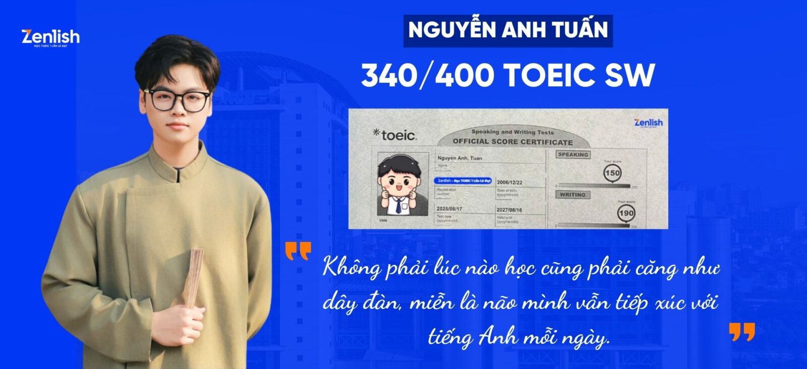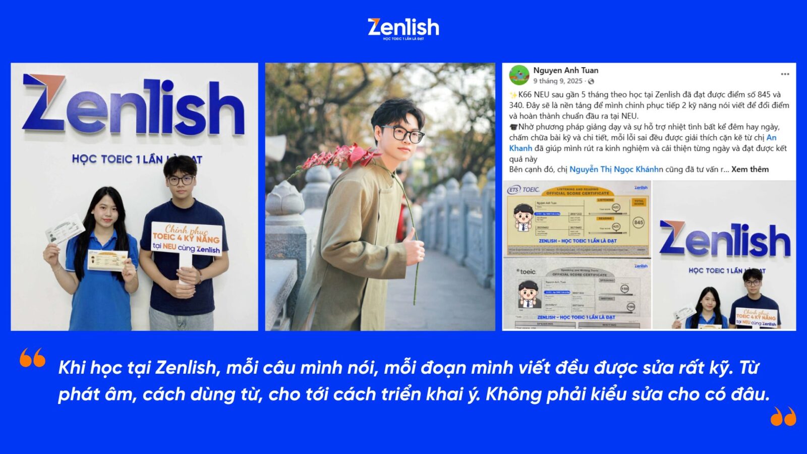 Ngay từ những buổi học đầu tiên, Tuấn đã cảm nhận rõ sự khác biệt. TOEIC Speaking & Writing vốn là hai kỹ năng khó, thường bị dạy khá “lướt” ở nhiều nơi. Nhưng tại Zenlish, trải nghiệm của Tuấn hoàn toàn ngược lại. Tuấn kể lại rằng: “Lần đầu tiên mình thấy được sửa kỹ đến vậy”