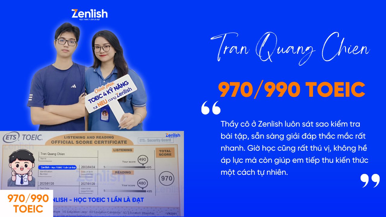 Trần Quang Chiến, sinh viên năm 2 trường Đại học Kinh tế Quốc dân, đã xuất sắc đạt số điểm gần như tuyệt đối – 970/990 TOEIC sau khi theo học tại Zenlish từ khóa Begin. Xuất phát điểm không quá cao, nhưng nhờ vào phương pháp học tập khoa học và sự hướng dẫn tận tình từ giáo viên, Chiến đã có màn bứt phá ngoạn mục. Đặc biệt giờ đây, Chiến còn tự tin sử dụng tiếng Anh trong cuộc sống hàng ngày, biến nó trở thành một công cụ quan trọng giúp mở ra nhiều cơ hội trong tương lai.