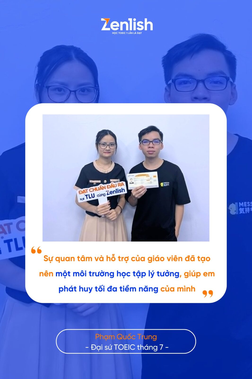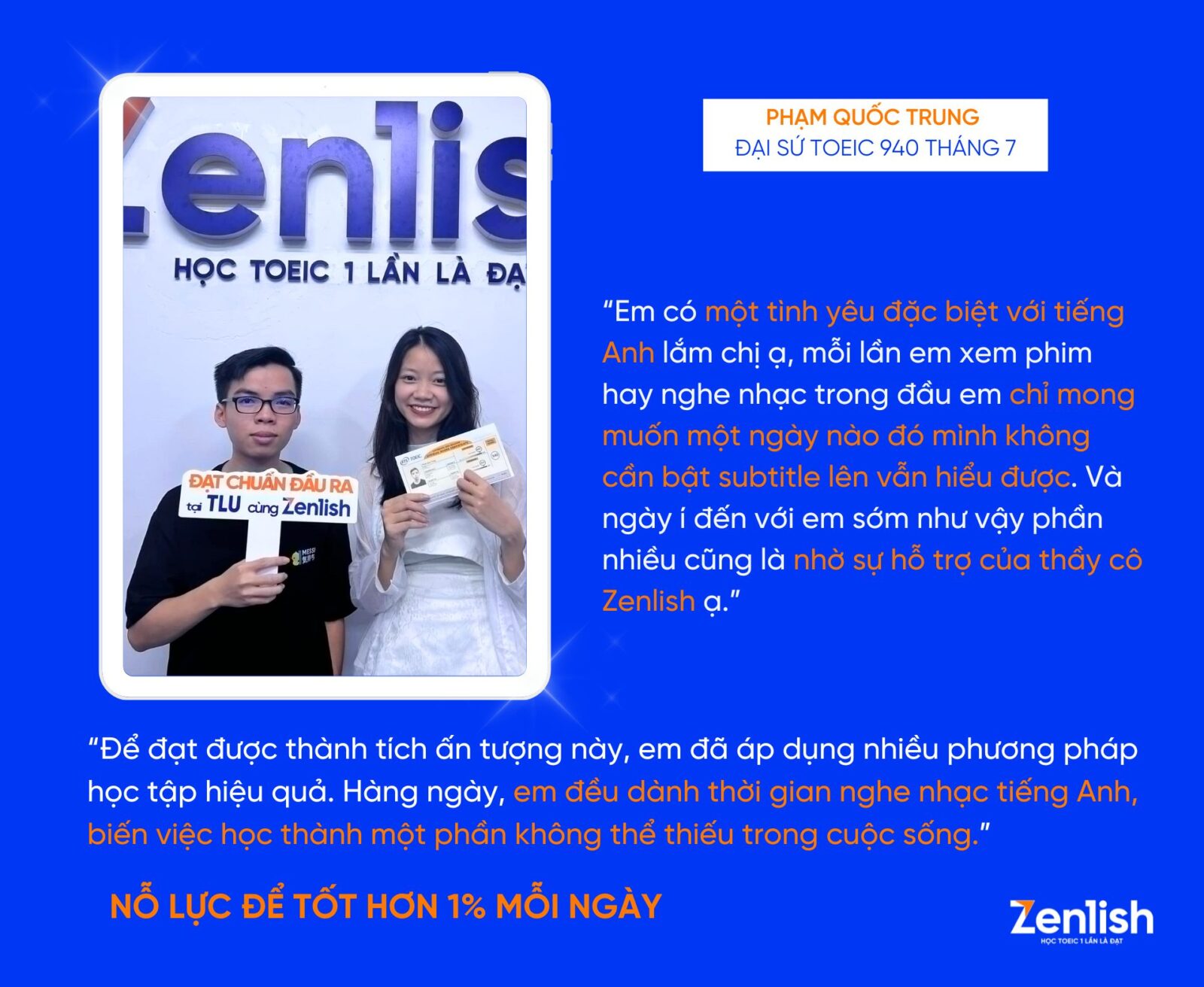 Phạm Quốc Trung, từ một sinh viên tự nhận ‘mất gốc’ tiếng Anh với khả năng nghe và đọc kém, đã gây sốc tại Zenlish. Sau 6 tháng, bắt đầu từ khóa học xây nền FOUNDATION, anh đạt 940/990 điểm TOEIC, một thành tích mà ngay cả Trung cũng không ngờ tới. Hành trình từ con số 0 đến gần như tuyệt đối này đã khiến thầy trò tại Zenlish phải trầm trồ.