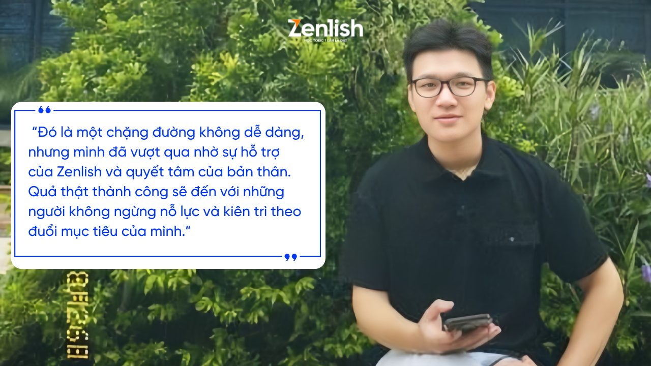 “Mình biết ơn Zenlish vì đã tạo điều kiện và hỗ trợ mình trong suốt quá trình học. Sự tận tâm và nhiệt tình của thầy cô đã giúp mình đạt được kết quả cao này. Mình cũng cảm ơn các bạn ở trong lớp đã cho mình những kỷ niệm khó quên tại đây.” Ninh chia sẻ.