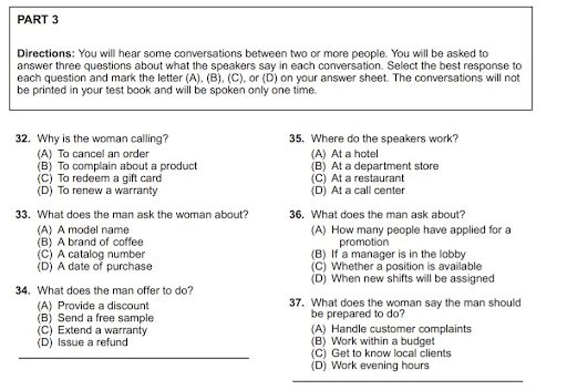 Bài nghe TOEIC Listening Part 3 bao gồm 39 câu hỏi trắc nghiệm trên tổng số 100 câu hỏi với nội dung tập trung vào 13 đoạn hội thoại ngắn giữa hai hoặc nhiều người.
