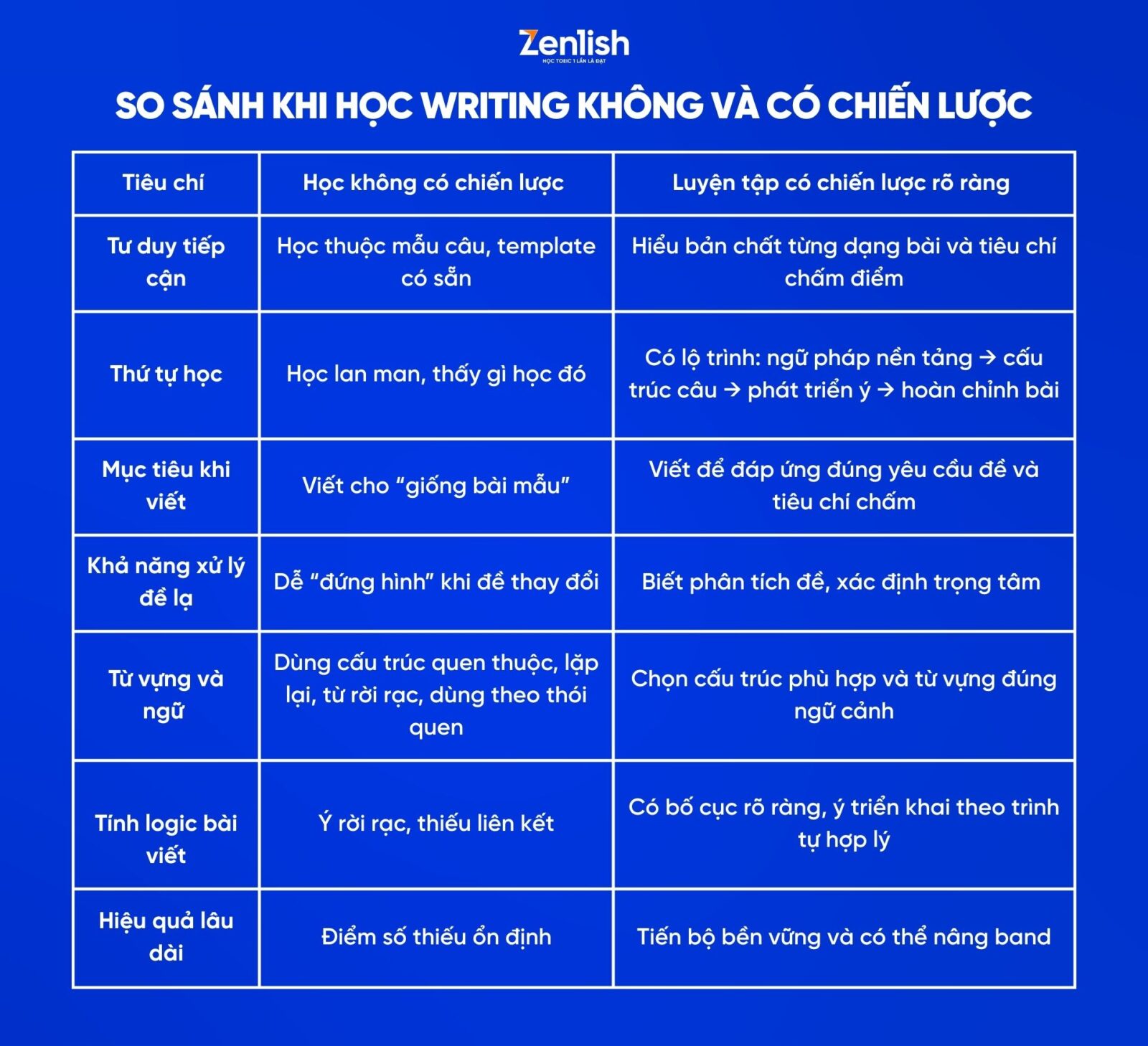 Vậy viết không có chiến lược khác gì học thuộc mẫu? Hãy xem bảng so sánh dưới đây: