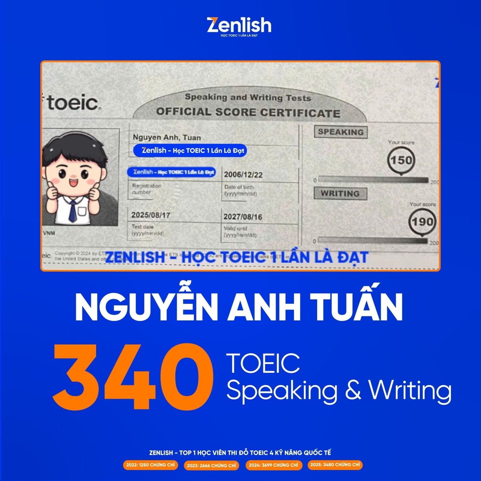 Bạn Nguyễn Anh Tuấn, một NEUer chia sẻ về khả năng Speaking của mình như sau: “Dù có nền tảng khá tốt khi đạt được 845 TOEIC LR nhưng khi nhắc đến kỹ năng Nói thì mình lại khá ngại. Các bạn biết rằng Speaking và Writing  là 2 kỹ năng rất khó, thường sẽ ít được tiếp xúc hơn”. Sau 6 tháng đồng hành cùng Zenlish thì Anh Tuấn đã chinh phục được con số 340/400 TOEIC 2 kỹ năng Speaking và Writing, trong đó Speaking đạt 150/200.