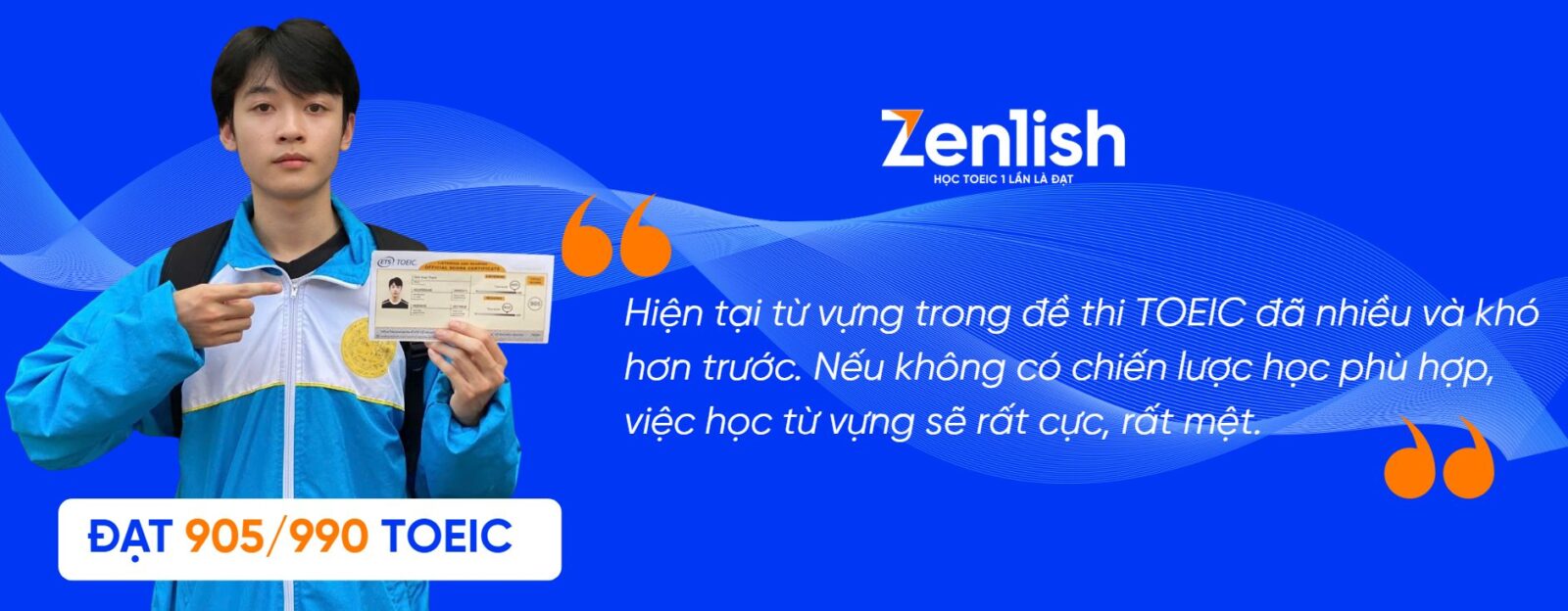 Từ mục tiêu 650 TOEIC để đổi chuẩn đầu ra, Đinh Xuân Thành – sinh viên Đại học Giao thông Vận tải (UTC) đã bứt phá gần 300 điểm và đạt 905 TOEIC. Cùng Zenlish khám phá lộ trình học TOEIC, phương pháp học từ vựng 10 phút mỗi ngày và những kinh nghiệm thực tế giúp Thành tăng điểm nhanh như thế này nhé!