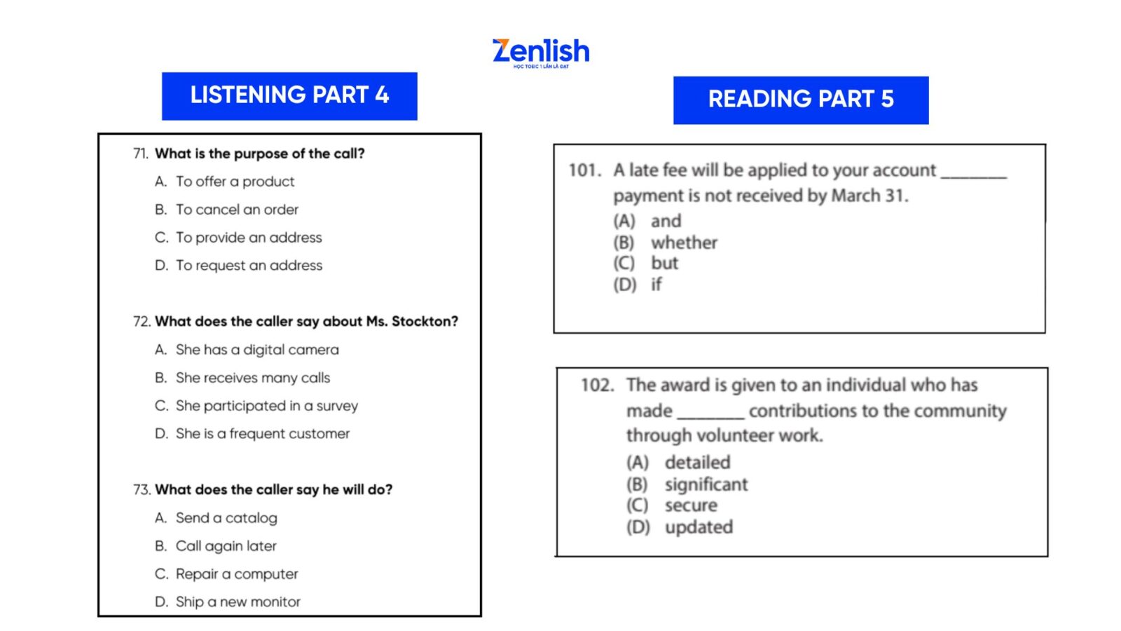 Câu hỏi Listening Part 4 và Reading Part 5 TOEIC
