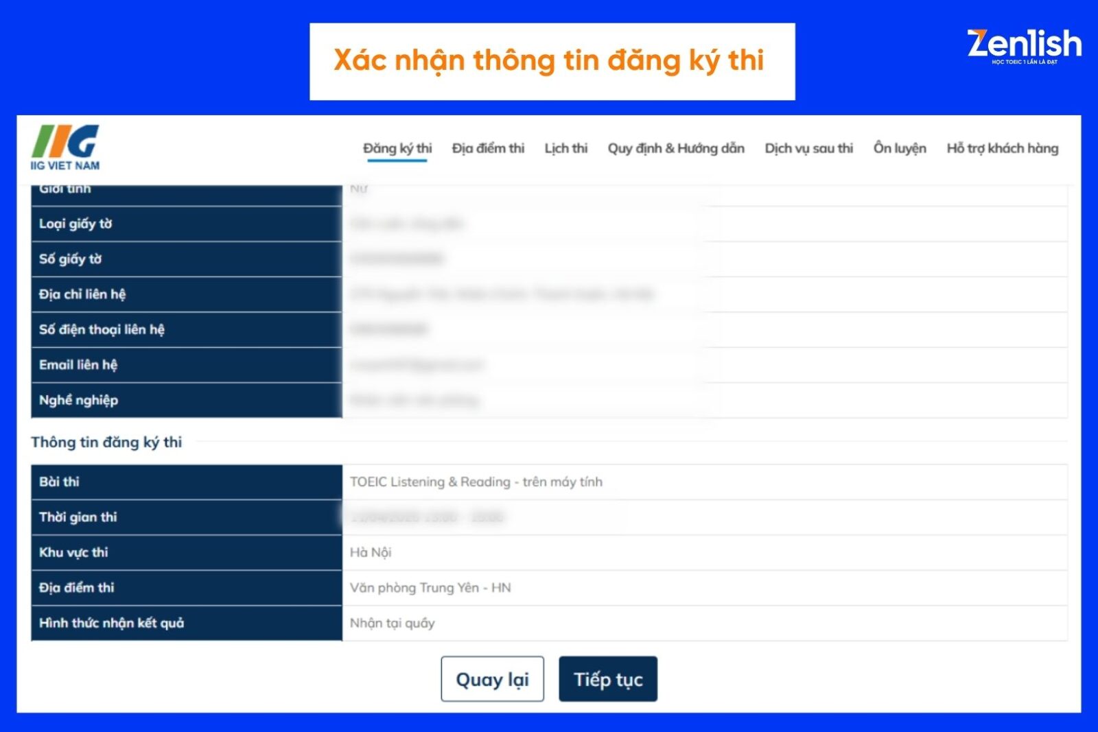 Sau khi điền thông tin xong, thí sinh chọn Tiếp tục để xác nhận thông tin đăng ký thi. Nếu thông tin đã chính xác, thí sinh chọn Tiếp tục để tiến hành xác nhận thông tin thanh toán.