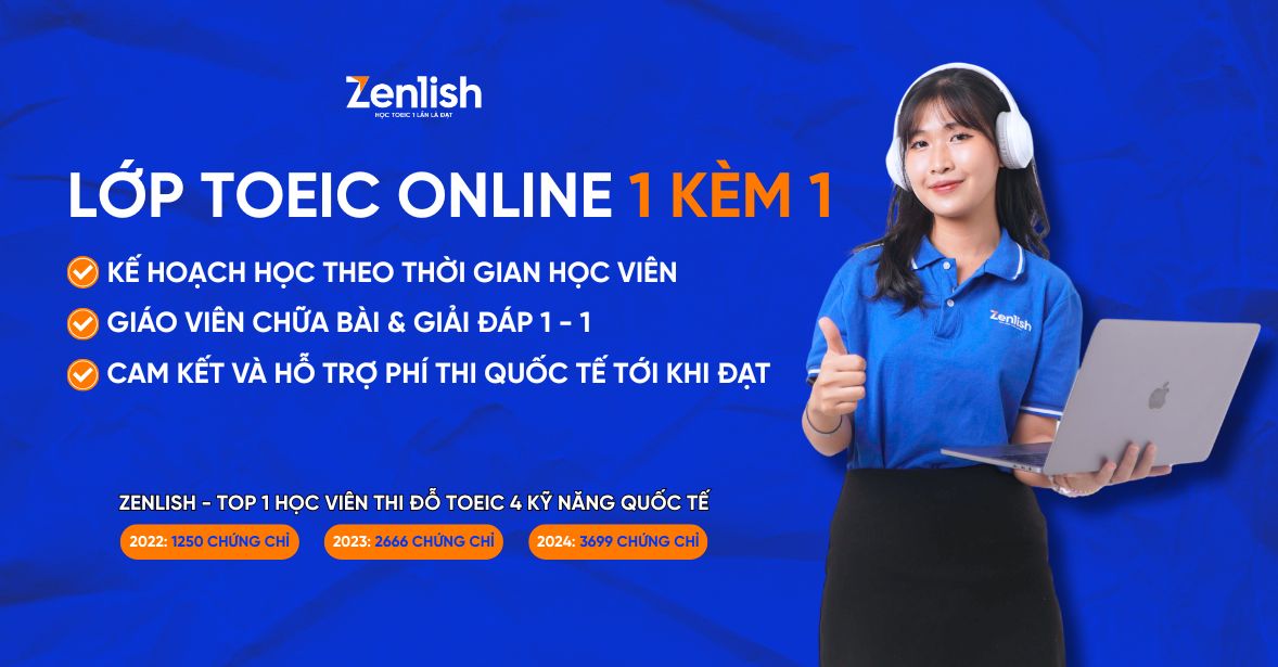 Hiện nay, Zenlish cung cấp khóa học TOEIC Online (1 kèm 1) là khóa học dành cho học sinh, sinh viên, người đi làm bận rộn hoặc ở xa, cần luyện TOEIC 4 kỹ năng theo hình thức học trực tuyến.